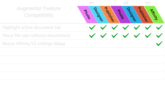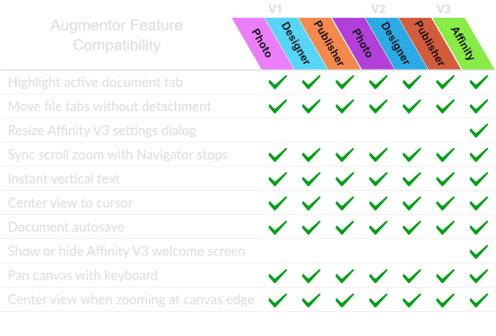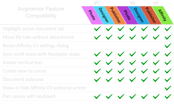 Wherever possible, V1 and V2 Affinity applications will be supported, providing value to users of the legacy versions as well as the new Affinity V3 (see Compatibility chart below). Furthermore, Augmentor has no subscription or account requirement, no online activation, no data collection, and no forced automatic updates.
